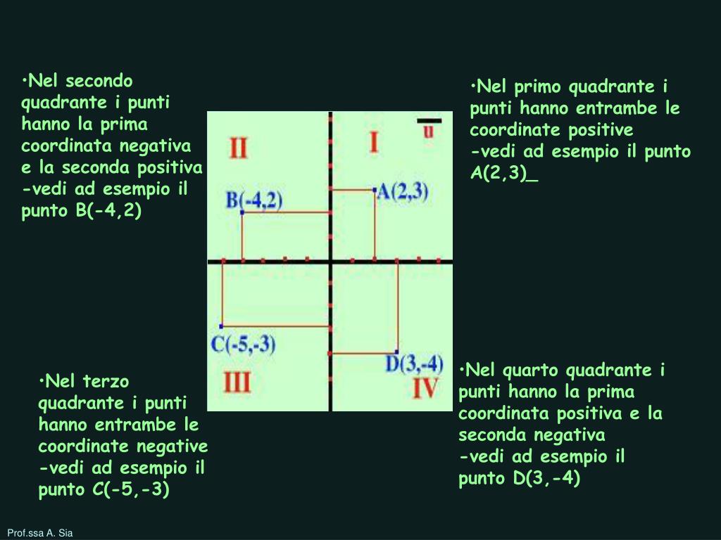 Nel secondo quadrante i punti hanno la prima coordinata negativa e la seconda positiva-vedi ad esempio il punto B(-4,2) • Nel primo quadrante i punti hanno entrambe le coordinate positive-vedi ad esempio il punto A(2,3)_ • Nel quarto quadrante i punti hanno la prima coordinata positiva e la seconda negativa -vedi ad esempio il punto D(3,-4) • Nel terzo quadrante i punti hanno entrambe le coordinate negative -vedi ad esempio il punto C(-5,-3)