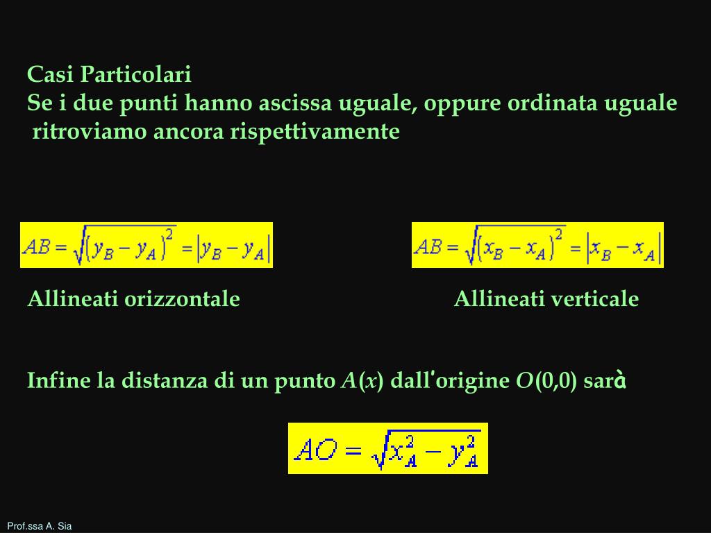 Casi Particolari Se i due punti hanno ascissa uguale, oppure ordinata uguale ritroviamo ancora rispettivamente Allineati orizzontale Allineati verticale Infine la distanza di un punto A(x) dall’origine O(0,0) sarà