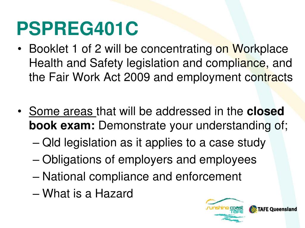 PSPREG401C • Booklet 1 of 2 will be concentrating on Workplace Health and Safety legislation and compliance, and the Fair Work Act 2009 and employment contracts • Some areas that will be addressed in the closed book exam: Demonstrate your understanding of; • Qld legislation as it applies to a case study • Obligations of employers and employees • National compliance and enforcement • What is a Hazard