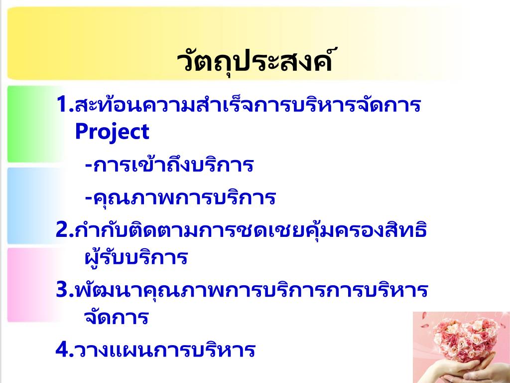 วัตถุประสงค์ 1.สะท้อนความสำเร็จการบริหารจัดการProject -การเข้าถึงบริการ -คุณภาพการบริการ 2.กำกับติดตามการชดเชยคุ้มครองสิทธิผู้รับบริการ 3.พัฒนาคุณภาพการบริการการบริหารจัดการ 4.วางแผนการบริหาร