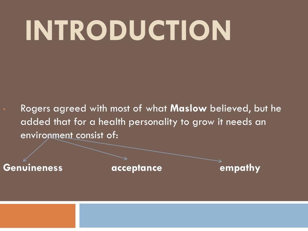 Introduction Rogers agreed with most of what Maslow believed, but he added that for a health personality to grow it needs an environment consist of: Genuineness acceptance empathy