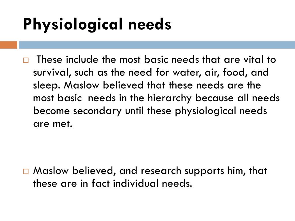 Physiologicalneeds • These include the most basic needs that are vital to survival, such as the need for water, air, food, and sleep. Maslow believed that these needs are the most basic needs in the hierarchy because all needs become secondary until these physiological needs are met. • Maslow believed, and research supports him, that these are in fact individual needs.