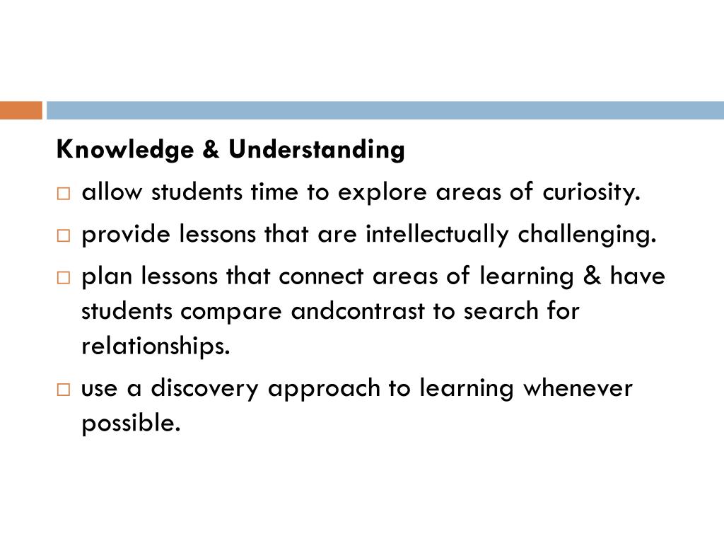 Knowledge & Understanding • allow students time to explore areas of curiosity. • provide lessons that are intellectually challenging. • plan lessons that connect areas of learning & have students compare andcontrast to search for relationships. • use a discovery approach to learning whenever possible.