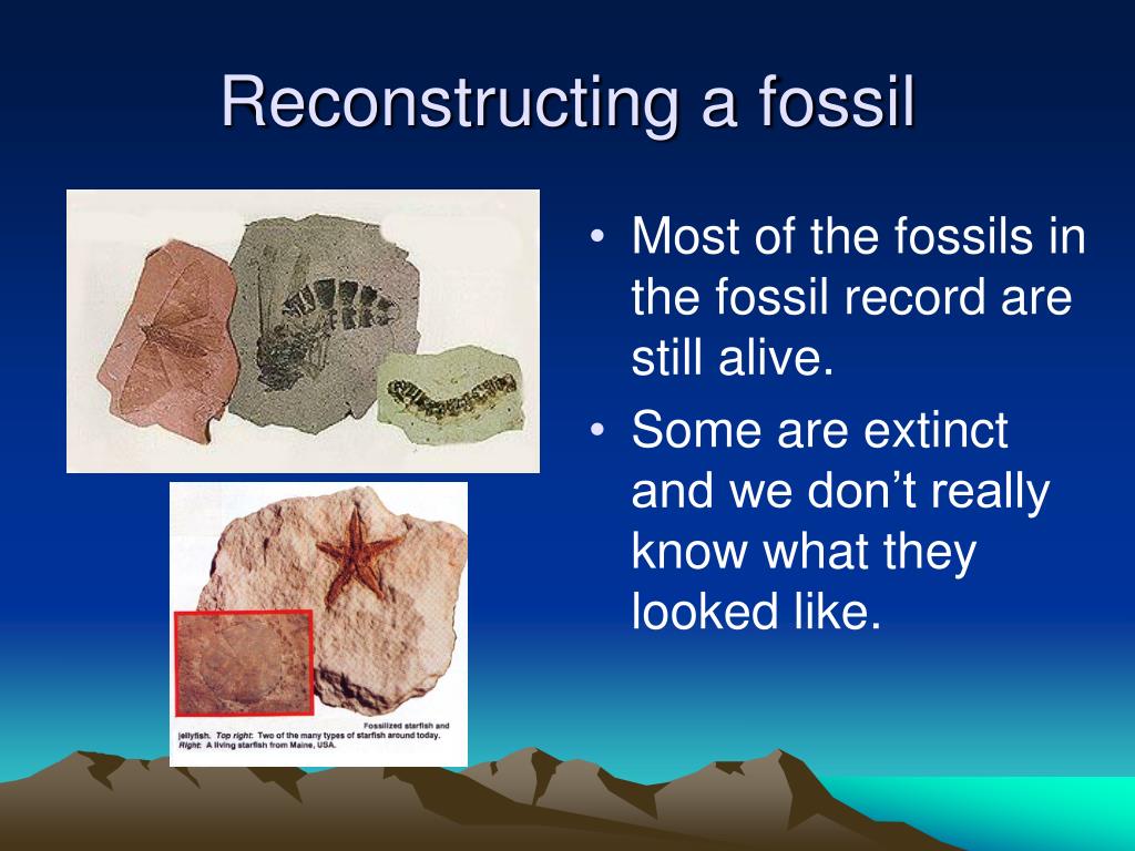 Reconstructing a fossil • Most of the fossils in the fossil record are still alive. • Some are extinct and we don’t really know what they looked like.