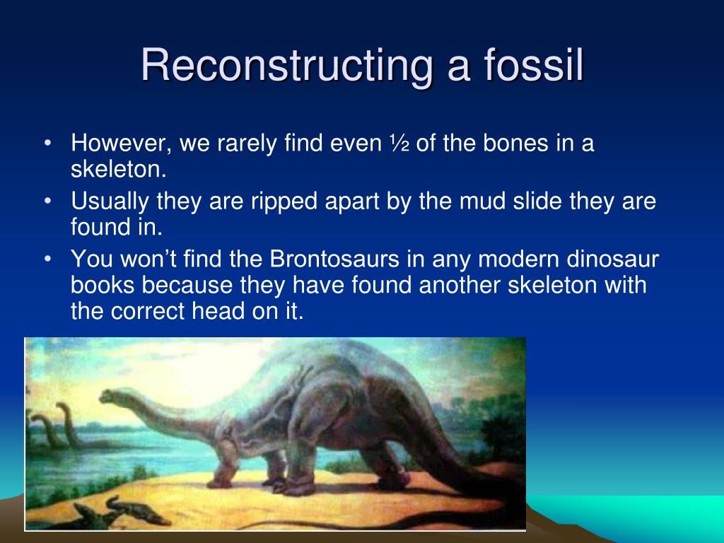 Reconstructing a fossil • However, we rarely find even ½ of the bones in a skeleton. • Usually they are ripped apart by the mud slide they are found in. • You won’t find the Brontosaurs in any modern dinosaur books because they have found another skeleton with the correct head on it.