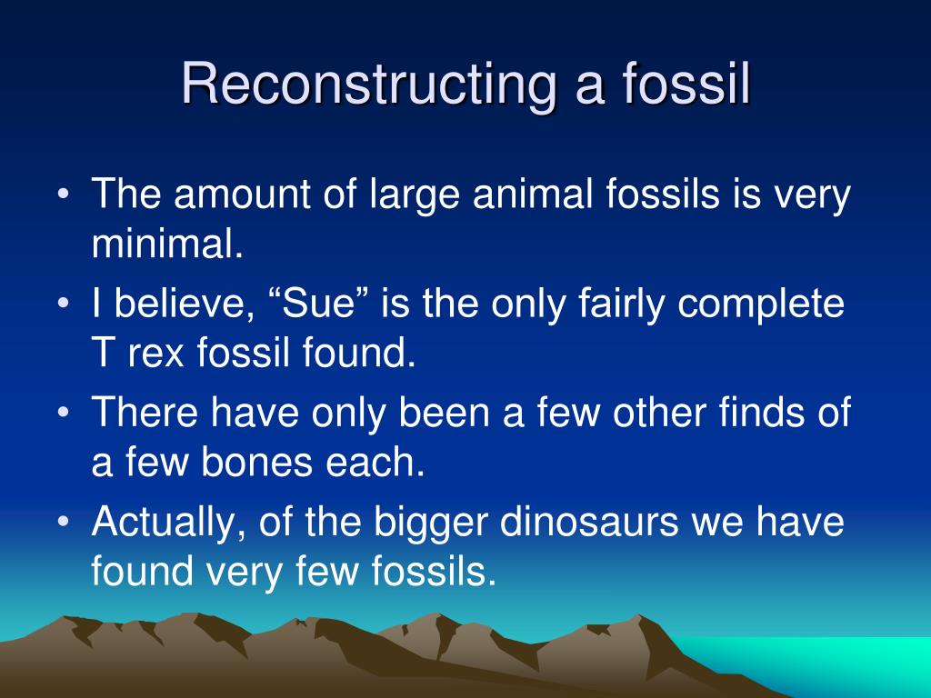 Reconstructing a fossil • The amount of large animal fossils is very minimal. • I believe, “Sue” is the only fairly complete T rex fossil found. • There have only been a few other finds of a few bones each. • Actually, of the bigger dinosaurs we have found very few fossils.