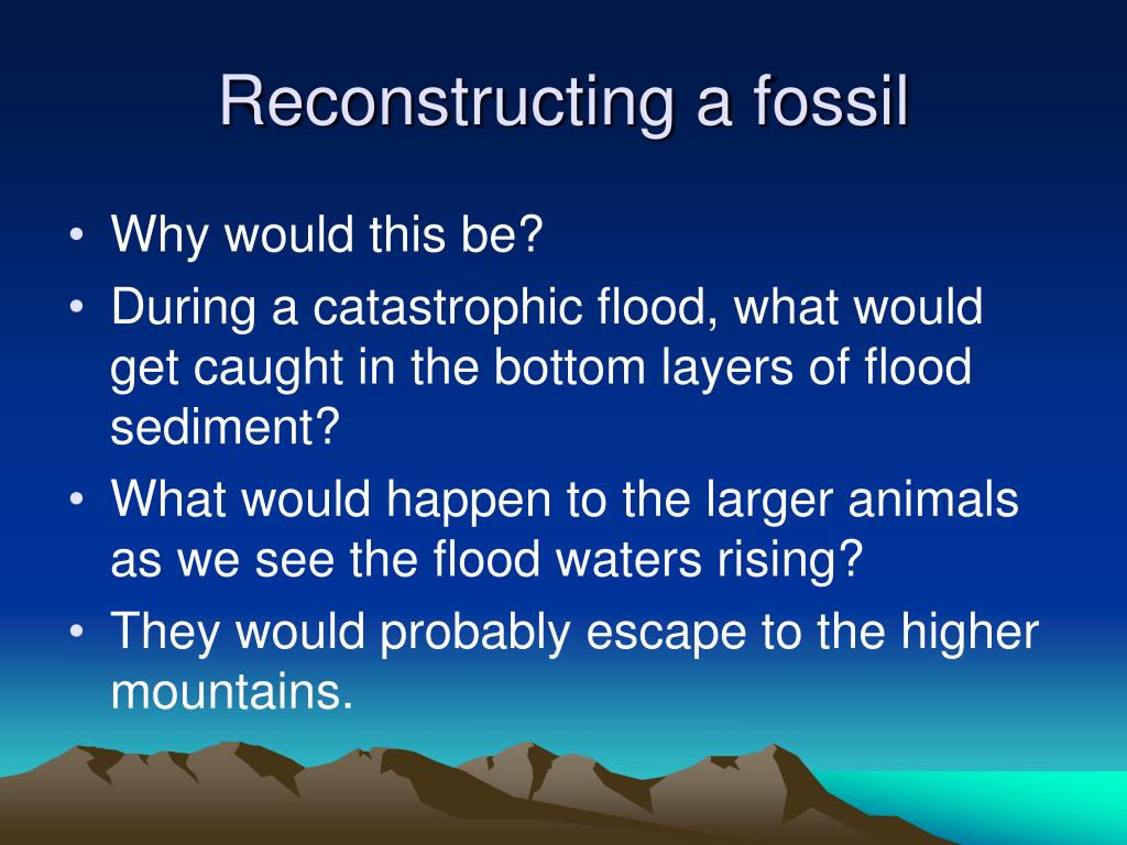 Reconstructing a fossil • Why would this be? • During a catastrophic flood, what would get caught in the bottom layers of flood sediment? • What would happen to the larger animals as we see the flood waters rising? • They would probably escape to the higher mountains.