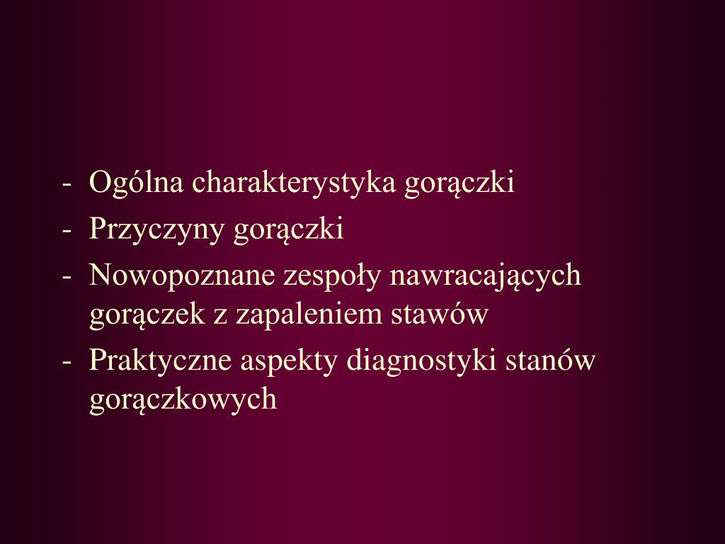 Ogólna charakterystyka gorączki • Przyczyny gorączki • Nowopoznane zespoły nawracających gorączek z zapaleniem stawów • Praktyczne aspekty diagnostyki stanów gorączkowych