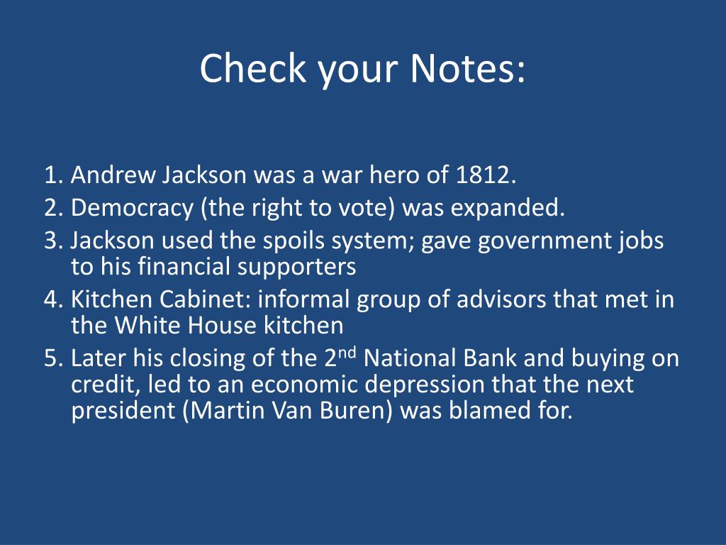 Check your Notes: 1. Andrew Jackson was a war hero of 1812. 2. Democracy (the right to vote) was expanded. 3. Jackson used the spoils system; gave government jobs to his financial supporters 4. Kitchen Cabinet: informal group of advisors that met in the White House kitchen 5. Later his closing of the 2nd National Bank and buying on credit, led to an economic depression that the next president (Martin Van Buren) was blamed for.