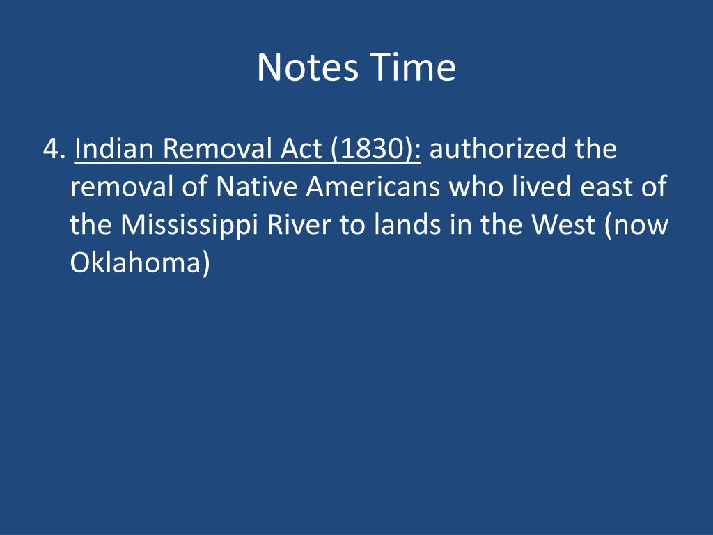 Notes Time 4. Indian Removal Act (1830): authorized the removal of Native Americans who lived east of the Mississippi River to lands in the West (now Oklahoma)
