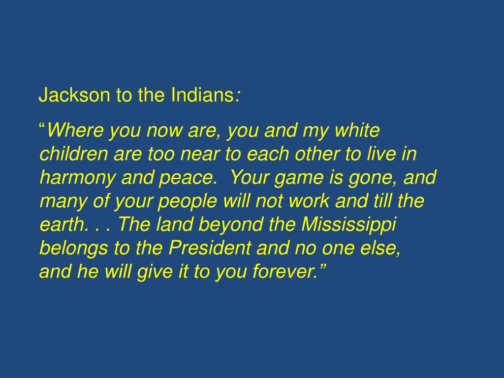 Jackson to the Indians: “Where you now are, you and my white children are too near to each other to live in harmony and peace. Your game is gone, and many of your people will not work and till the earth. . . The land beyond the Mississippi belongs to the President and no one else, and he will give it to you forever.”