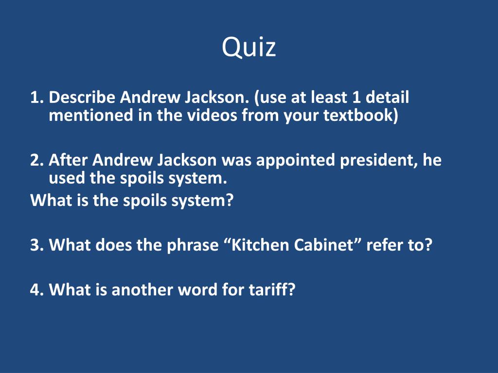 Quiz 1. Describe Andrew Jackson. (use at least 1 detail mentioned in the videos from your textbook) 2. After Andrew Jackson was appointed president, he used the spoils system. What is the spoils system? 3. What does the phrase “Kitchen Cabinet” refer to? 4. What is another word for tariff?
