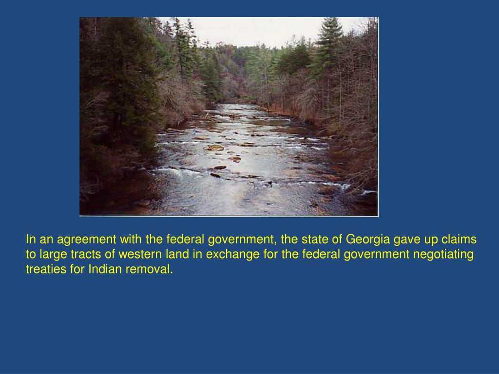 In an agreement with the federal government, the state of Georgia gave up claims to large tracts of western land in exchange for the federal government negotiating treaties for Indianremoval.