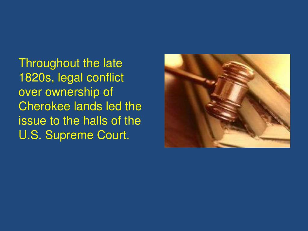 Throughout the late 1820s, legal conflict over ownership of Cherokee lands led the issue to the halls of the U.S. Supreme Court.