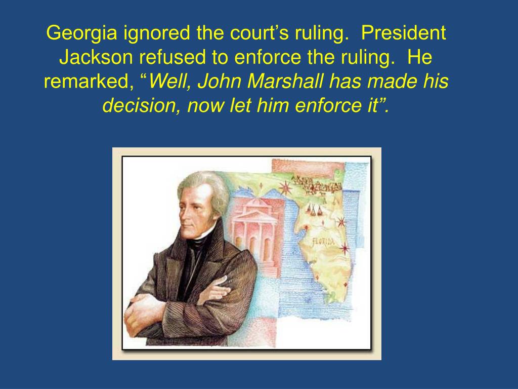 Georgia ignored the court’s ruling. President Jackson refused to enforce the ruling. He remarked, “Well, John Marshall has made his decision, now let him enforce it”.