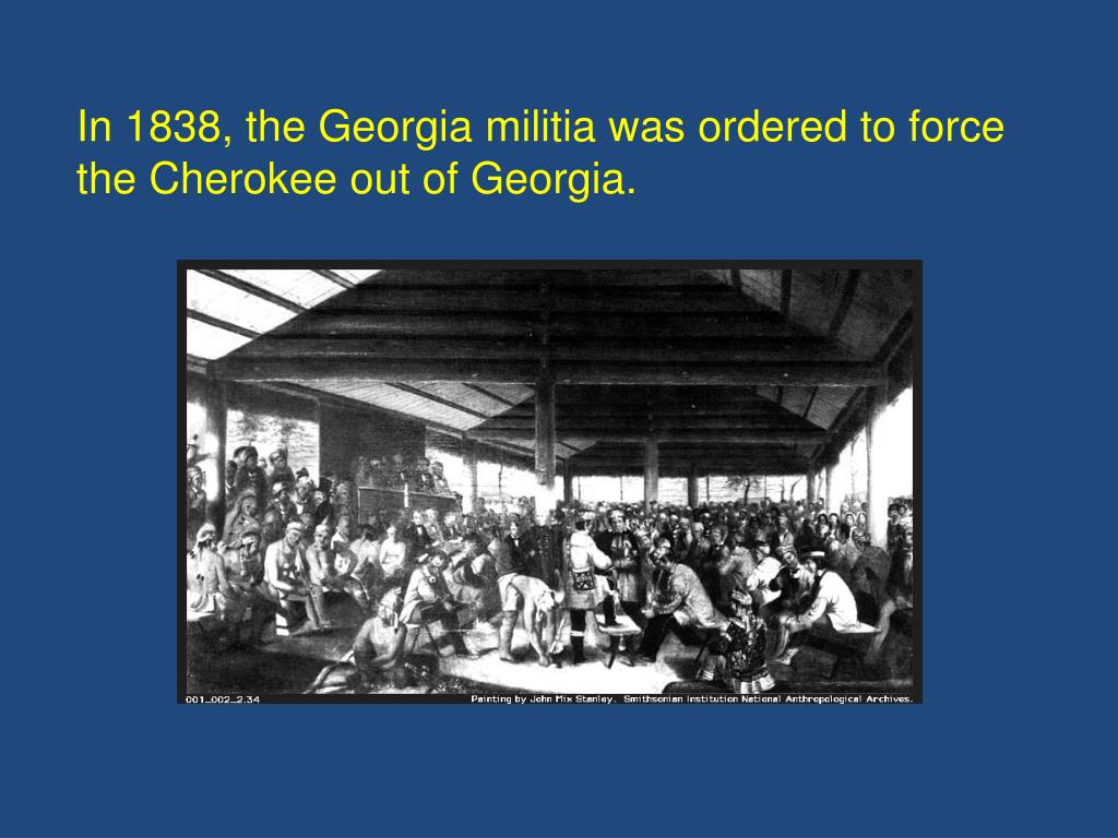 In 1838, the Georgia militia was ordered to force the Cherokee out of Georgia.