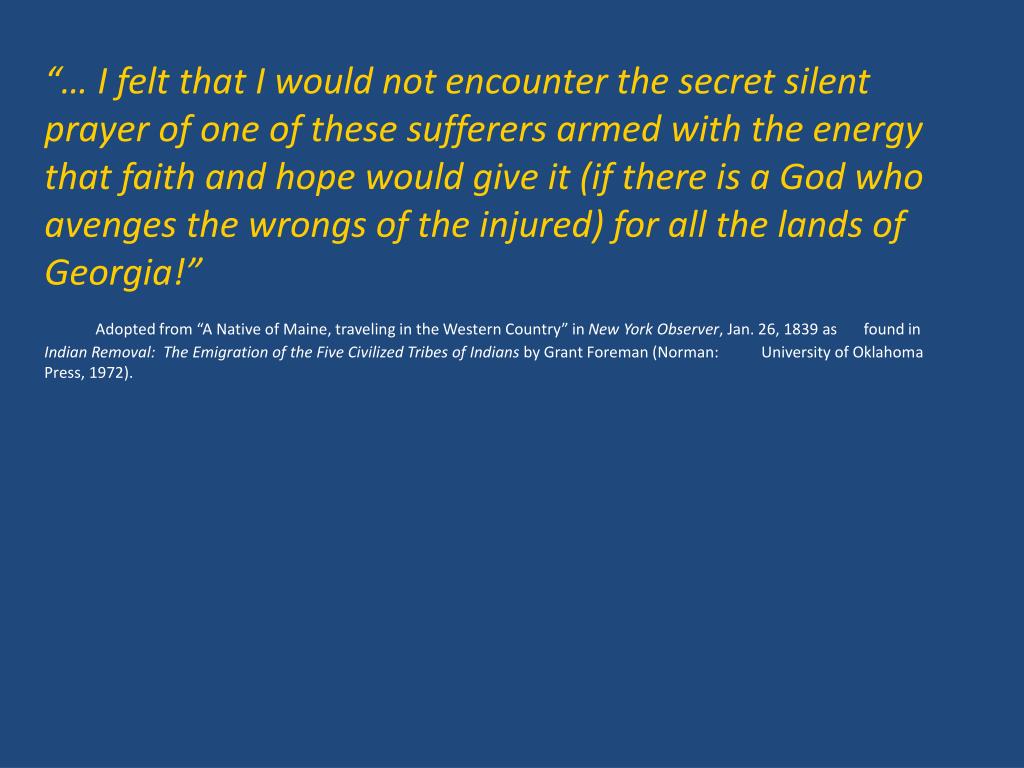 “… I felt that I would not encounter the secret silent prayer of one of these sufferers armed with the energy that faith and hope would give it (if there is a God who avenges the wrongs of the injured) for all the lands of Georgia!” Adopted from “A Native of Maine, traveling in the Western Country” in New York Observer, Jan. 26, 1839 as found in Indian Removal: The Emigration of the Five Civilized Tribes of Indians by Grant Foreman (Norman: University of Oklahoma Press, 1972).