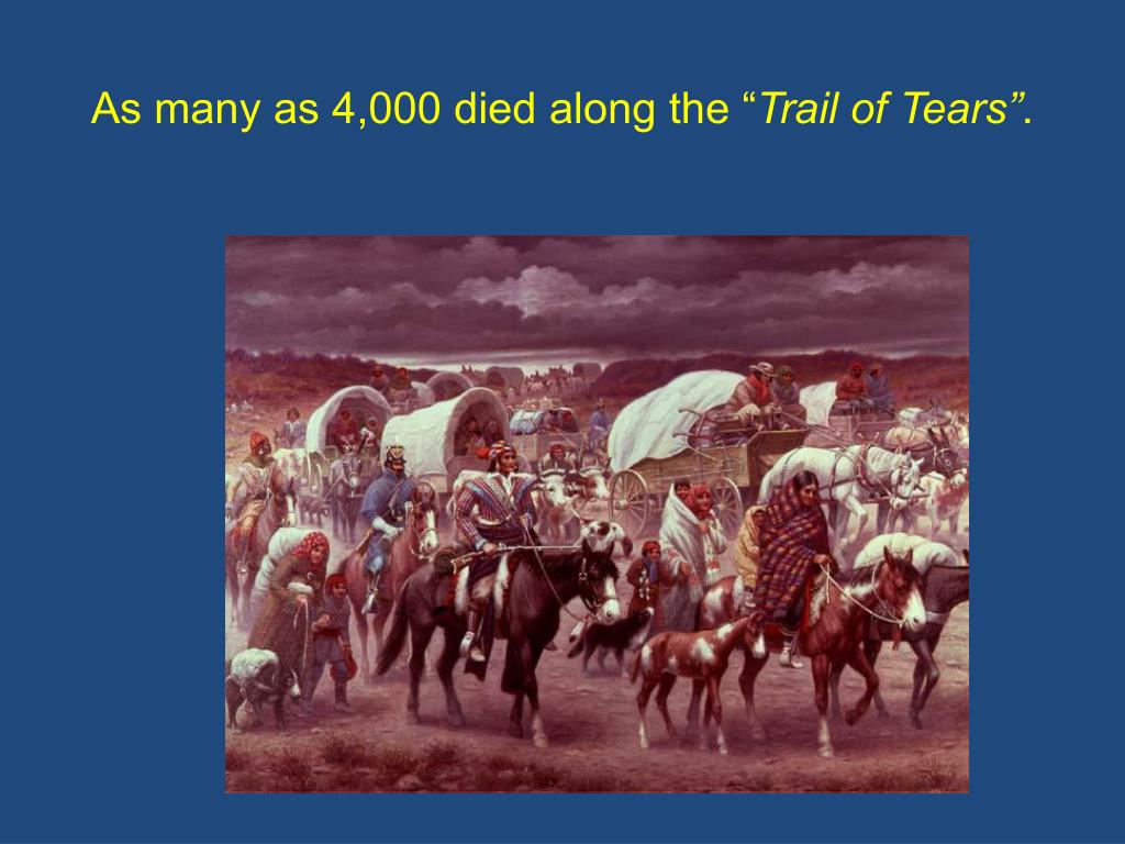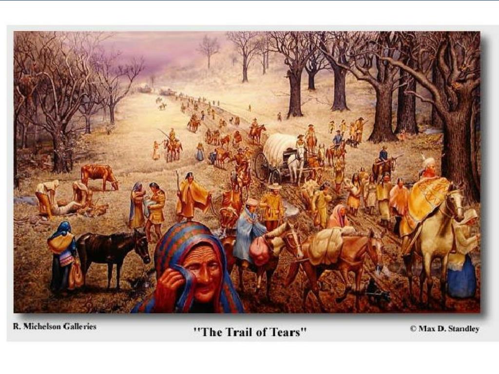 Trail of Tears: Cherokee’s 800 mile forced march (about ¼ of the Indians died along the way) p334 Questions to answer afterward: • What was the purpose of the Indian Removal?What effect does this have on Native Americans today?