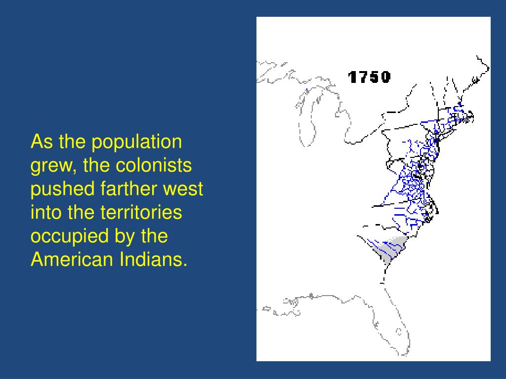 As the population grew, the colonists pushed farther west into the territories occupied by the American Indians.