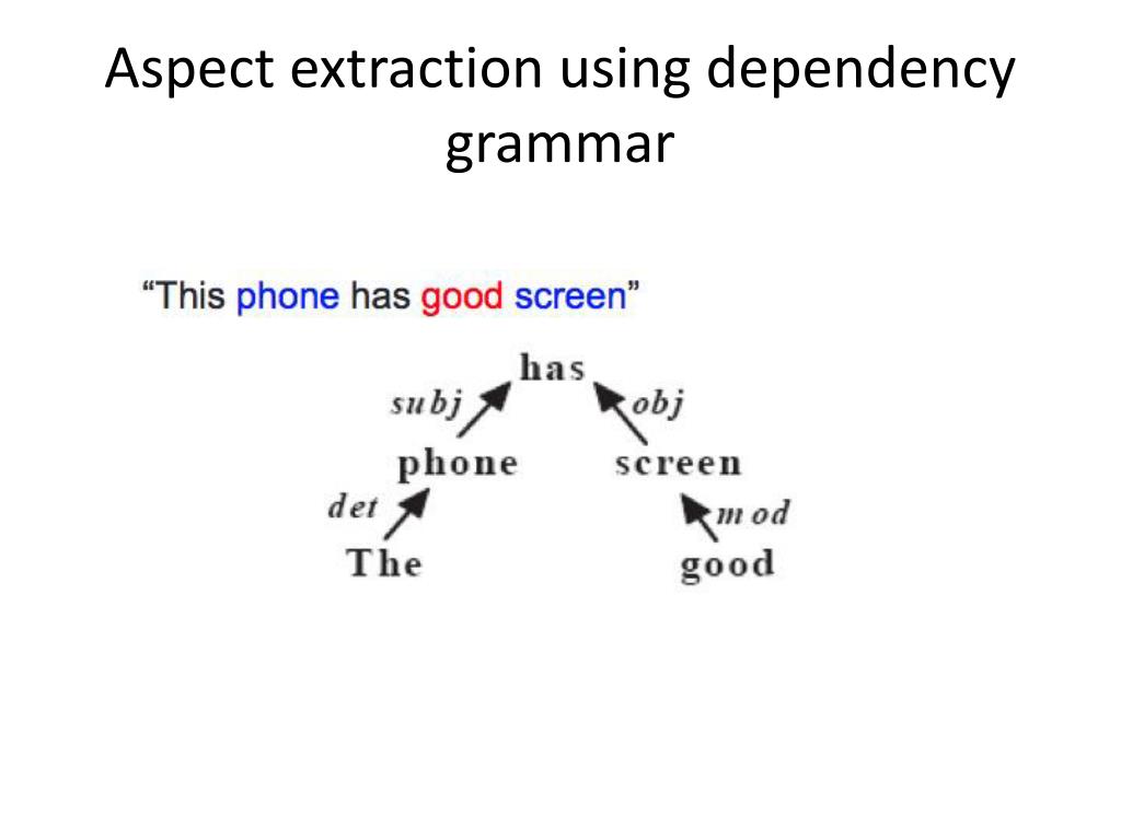 Feature/Aspect extraction • May extract frequent nouns and noun phrases • Sometimes limited to a set known to be related to the entity of interest or using part discriminators • e.g., for a scanner entity “scanner”, “scanner has” • opinion and target relations • Proximity or syntactic dependency • Standard IE methods • Rule-based or supervised learning • Often HMMs or CRFs (like standard IE)