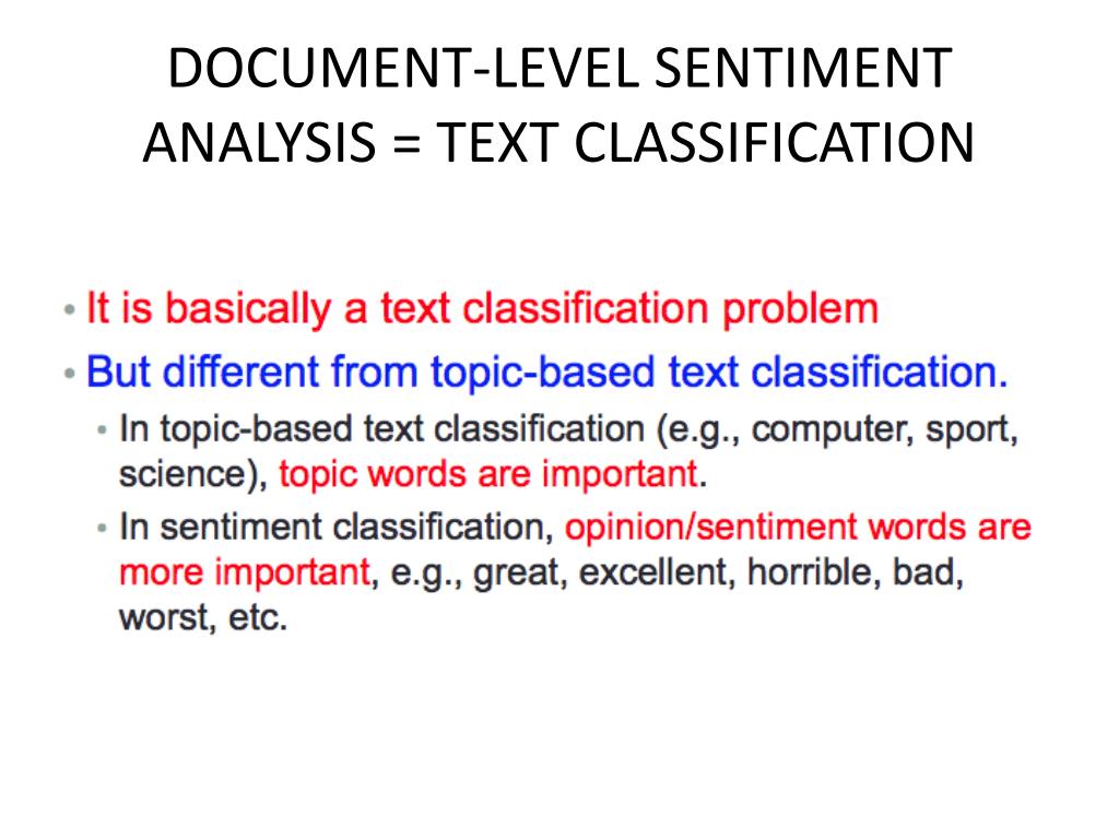 FEATURES FOR SUPERVISED DOCUMENT-LEVEL SENTIMENT ANALYSIS • A large set of features have been tried by researchers • Terms frequency and different IR weighting schemes as in other work on classification • Part of speech (POS) tags • Opinion words and phrases • Negations • Syntactic dependency