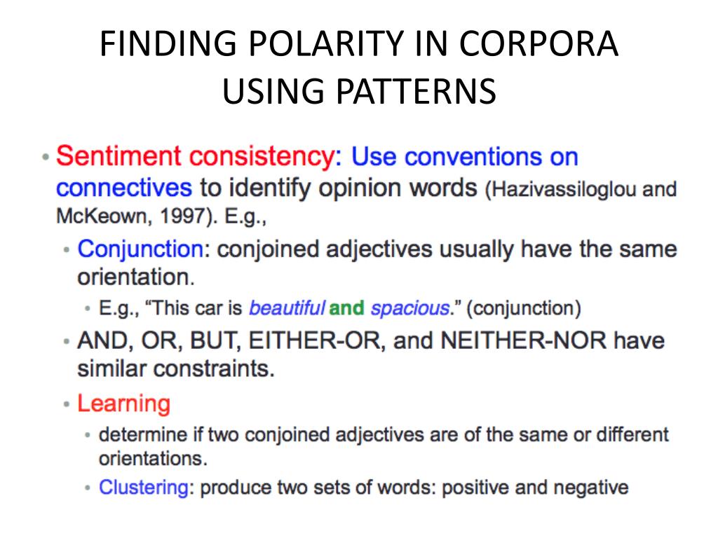 (Semi) Automatic creation of sentiment lexica ICWSM 2008 • Find relevant words, phrases, patterns that can be used to express subjectivity • Determine the polarity of subjective expressions