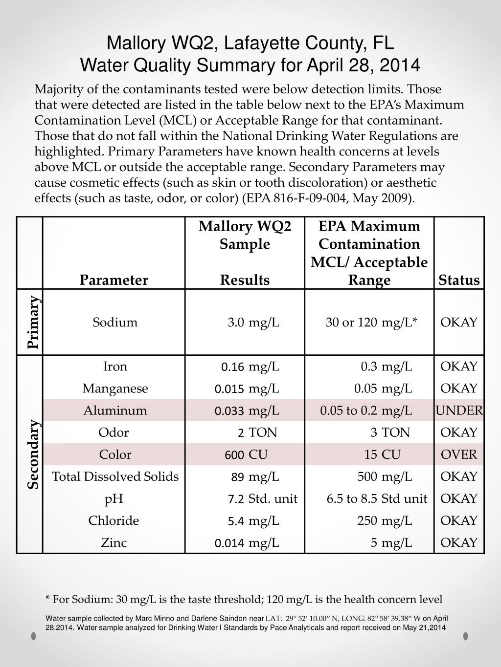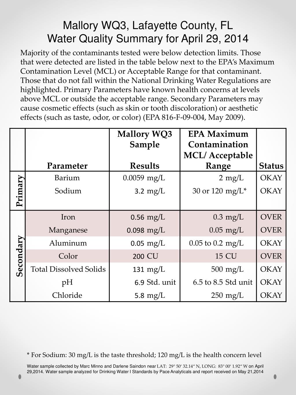 Mallory WQ2, Lafayette County, FL Water Quality Summary for April 28, 2014 Majority of the contaminants tested were below detection limits. Those that were detected are listed in the table below next to the EPA’s Maximum Contamination Level (MCL) or Acceptable Range for that contaminant. Those that do not fall within the National Drinking Water Regulations are highlighted. Primary Parameters have known health concerns at levels above MCL or outside the acceptable range. Secondary Parameters may cause cosmetic effects (such as skin or tooth discoloration) or aesthetic effects (such as taste, odor, or color) (EPA 816-F-09-004, May 2009). * For Sodium: 30 mg/L is the taste threshold; 120 mg/L is the health concern level Water sample collected by Marc Minno and Darlene Saindon near LAT: 29° 52‘ 10.00“ N, LONG: 82° 58‘ 39.38“ W on April 28,2014. Water sample analyzed for Drinking Water I Standards by Pace Analyticals and report received on May 21,2014