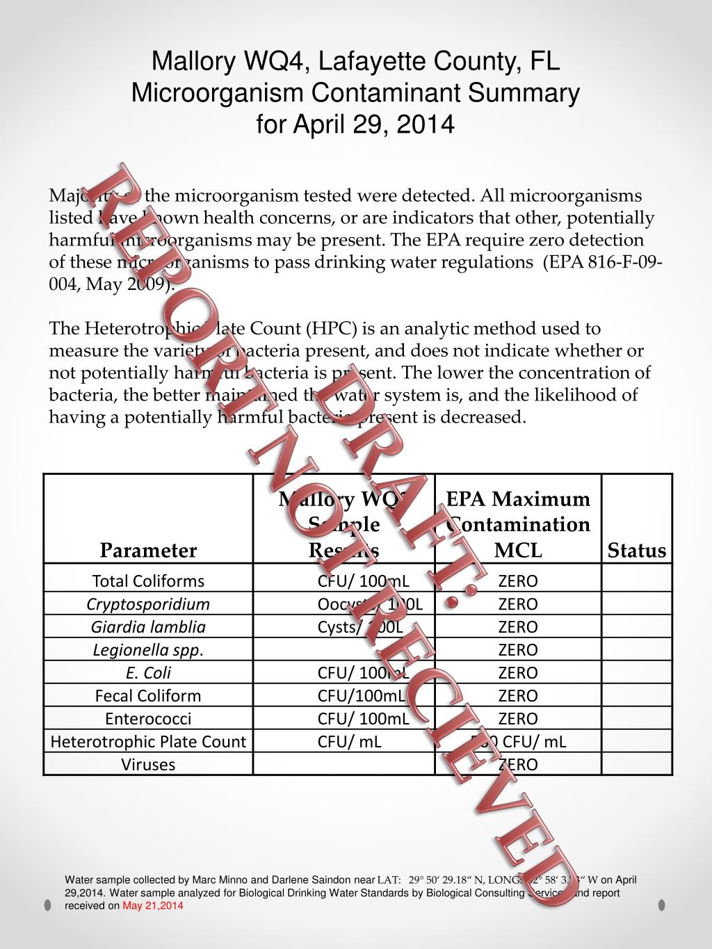 Mallory WQ4, Lafayette County, FL Microorganism Contaminant Summary for April 29, 2014 Majority of the microorganism tested were detected. All microorganisms listed have known health concerns, or are indicators that other, potentially harmful microorganisms may be present. The EPA require zero detection of these microorganisms to pass drinking water regulations (EPA 816-F-09-004, May 2009). The Heterotrophic Plate Count (HPC) is an analytic method used to measure the variety of bacteria present, and does not indicate whether or not potentially harmful bacteria is present. The lower the concentration of bacteria, the better maintained the water system is, and the likelihood of having a potentially harmful bacteria present is decreased. DRAFT: REPORT NOT RECIEVED Water sample collected by Marc Minno and Darlene Saindon near LAT: 29° 50‘ 29.18“ N, LONG: 82° 58‘ 3.73“ W on April 29,2014. Water sample analyzed for Biological Drinking Water Standards by Biological Consulting Services and report received on May 21,2014