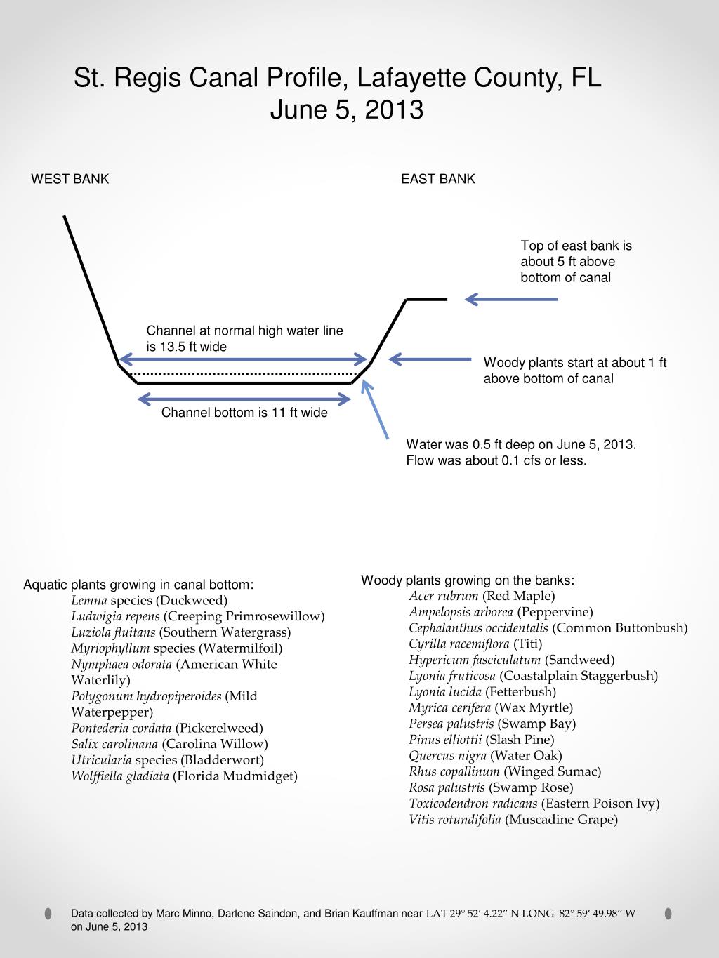St. Regis Canal Profile, Lafayette County, FL June 5, 2013 WEST BANK EAST BANK Top of east bank is about 5 ft above bottom of canal Channel at normal high water line is 13.5 ft wide Woody plants start at about 1 ft above bottom of canal Channel bottom is 11 ft wide Water was 0.5 ft deep on June 5, 2013. Flow was about 0.1 cfs or less. • Woody plants growing on the banks: • Acer rubrum (Red Maple) • Ampelopsis arborea (Peppervine) • Cephalanthusoccidentalis (Common Buttonbush) • Cyrillaracemiflora (Titi) • Hypericumfasciculatum (Sandweed) • Lyoniafruticosa (Coastalplain Staggerbush) • Lyonialucida (Fetterbush) • Myricacerifera (Wax Myrtle) • Perseapalustris (Swamp Bay) • Pinuselliottii (Slash Pine) • Quercusnigra (Water Oak) • Rhuscopallinum (Winged Sumac) • Rosa palustris (Swamp Rose) • Toxicodendronradicans (Eastern Poison Ivy) • Vitisrotundifolia (Muscadine Grape) • Aquatic plants growing in canal bottom: • Lemna species (Duckweed) • Ludwigiarepens (Creeping Primrosewillow) • Luziolafluitans (Southern Watergrass) • Myriophyllum species (Watermilfoil) • Nymphaeaodorata (American White Waterlily) • Polygonumhydropiperoides (Mild Waterpepper) • Pontederiacordata (Pickerelweed) • Salix carolinana (Carolina Willow) • Utricularia species (Bladderwort) • Wolffiellagladiata (Florida Mudmidget) Data collected by Marc Minno, Darlene Saindon, and Brian Kauffman near LAT 29° 52’ 4.22” N LONG 82° 59’ 49.98” W on June 5, 2013