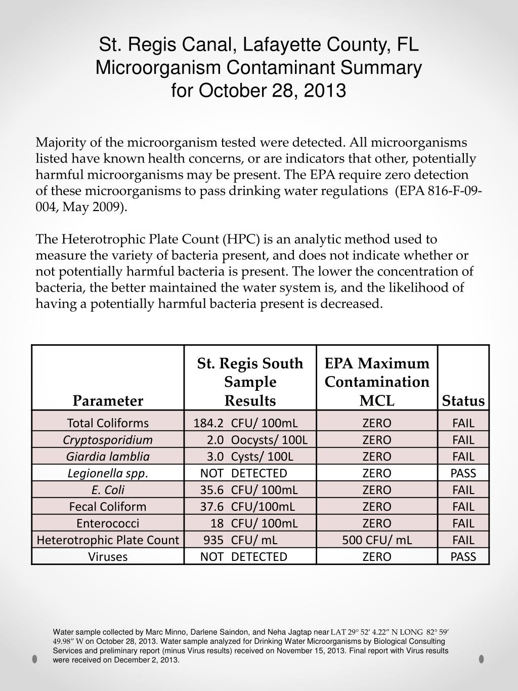 St. Regis Canal, Lafayette County, FL Microorganism Contaminant Summary for October 28, 2013 Majority of the microorganism tested were detected. All microorganisms listed have known health concerns, or are indicators that other, potentially harmful microorganisms may be present. The EPA require zero detection of these microorganisms to pass drinking water regulations (EPA 816-F-09-004, May 2009). The Heterotrophic Plate Count (HPC) is an analytic method used to measure the variety of bacteria present, and does not indicate whether or not potentially harmful bacteria is present. The lower the concentration of bacteria, the better maintained the water system is, and the likelihood of having a potentially harmful bacteria present is decreased. Water sample collected by Marc Minno, Darlene Saindon, and Neha Jagtap near LAT 29° 52’ 4.22” N LONG 82° 59’ 49.98” W on October 28, 2013. Water sample analyzed for Drinking Water Microorganisms by Biological Consulting Services and preliminary report (minus Virus results) received on November 15, 2013. Final report with Virus results were received on December 2, 2013.