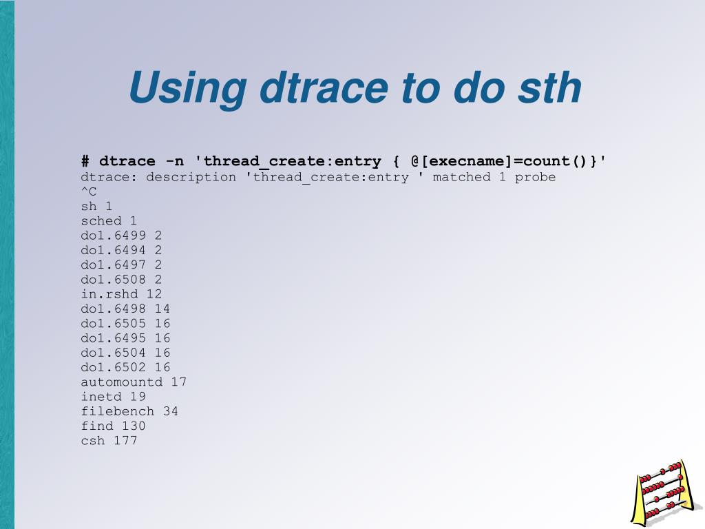 # dtrace -n 'thread_create:entry { @[execname]=count()}' dtrace: description 'thread_create:entry ' matched 1 probe ^C sh 1 sched 1 do1.6499 2 do1.6494 2 do1.6497 2 do1.6508 2 in.rshd 12 do1.6498 14 do1.6505 16 do1.6495 16 do1.6504 16 do1.6502 16 automountd 17 inetd 19 filebench 34 find 130 csh 177 Using dtrace to do sth