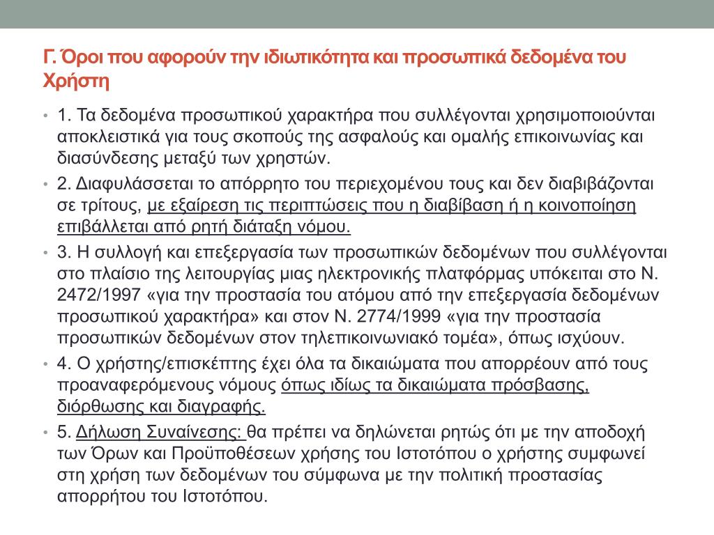 Γ. Όροι που αφορούν την ιδιωτικότητα και προσωπικά δεδομένα του Χρήστη • 1. Τα δεδομένα προσωπικού χαρακτήρα που συλλέγονται χρησιμοποιούνται αποκλειστικά για τους σκοπούς της ασφαλούς και ομαλής επικοινωνίας και διασύνδεσης μεταξύ των χρηστών. • 2. Διαφυλάσσεται το απόρρητο του περιεχομένου τους και δεν διαβιβάζονται σε τρίτους, με εξαίρεση τις περιπτώσεις που η διαβίβαση ή η κοινοποίηση επιβάλλεται από ρητή διάταξη νόμου. • 3. Η συλλογή και επεξεργασία των προσωπικών δεδομένων που συλλέγονται στο πλαίσιο της λειτουργίας μιας ηλεκτρονικής πλατφόρμας υπόκειται στο Ν. 2472/1997 «για την προστασία του ατόμου από την επεξεργασία δεδομένων προσωπικού χαρακτήρα» και στον Ν. 2774/1999 «για την προστασία προσωπικών δεδομένων στον τηλεπικοινωνιακό τομέα», όπως ισχύουν. • 4. Ο χρήστης/επισκέπτης έχει όλα τα δικαιώματα που απορρέουν από τους προαναφερόμενους νόμους όπως ιδίως τα δικαιώματα πρόσβασης, διόρθωσης και διαγραφής. • 5. Δήλωση Συναίνεσης: θα πρέπει να δηλώνεται ρητώς ότι με την αποδοχή των Όρων και Προϋποθέσεων χρήσης του Ιστοτόπου ο χρήστης συμφωνεί στη χρήση των δεδομένων του σύμφωνα με την πολιτική προστασίας απορρήτου του Ιστοτόπου.