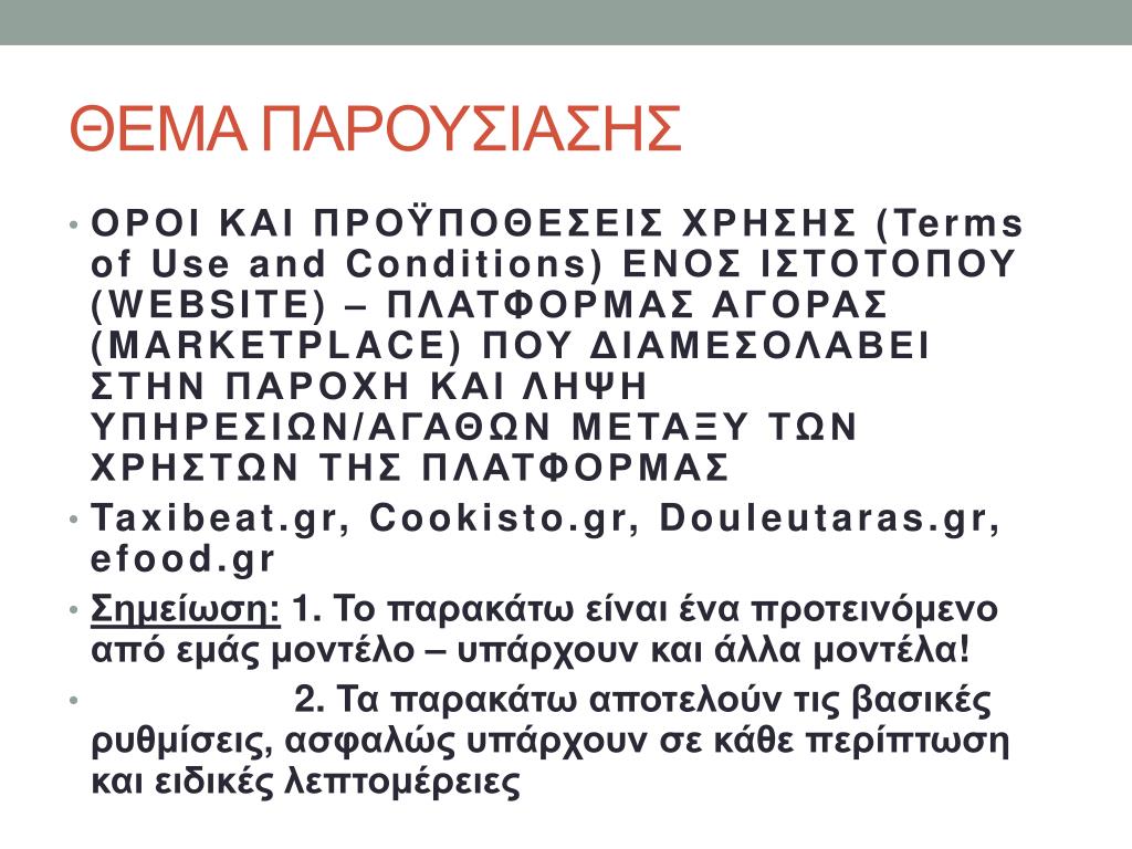 ΘΕΜΑ ΠΑΡΟΥΣΙΑΣΗΣ • ΟΡΟΙ ΚΑΙ ΠΡΟΫΠΟΘΕΣΕΙΣ ΧΡΗΣΗΣ (Terms of Use and Conditions) ΕΝΟΣ ΙΣΤΟΤΟΠΟΥ (WEBSITE) – ΠΛΑΤΦΟΡΜΑΣ AΓΟΡΑΣ (MARKETPLACE) ΠΟΥ ΔΙΑΜΕΣΟΛΑΒΕΙ ΣΤΗΝ ΠΑΡΟΧΗ ΚΑΙ ΛΗΨΗ ΥΠΗΡΕΣΙΩΝ/ΑΓΑΘΩΝ ΜΕΤΑΞΥ ΤΩΝ ΧΡΗΣΤΩΝΤΗΣ ΠΛΑΤΦΟΡΜΑΣ • Taxibeat.gr, Cookisto.gr, Douleutaras.gr, efood.gr • Σημείωση:1. Τοπαρακάτωείναιένα προτεινόμενοαπόεμάςμοντέλο – υπάρχουνκαιάλλα μοντέλα! • 2. Τα παρακάτω αποτελούν τις βασικές ρυθμίσεις, ασφαλώς υπάρχουν σε κάθε περίπτωση και ειδικές λεπτομέρειες