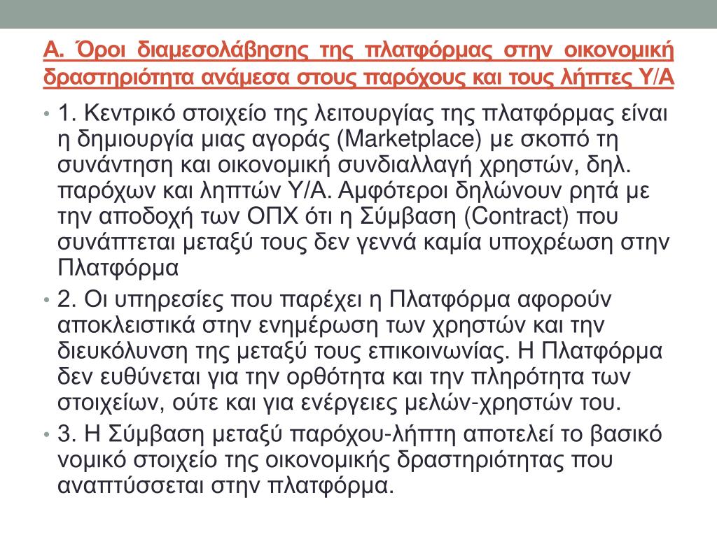 Α. Όροι διαμεσολάβησης της πλατφόρμας στην οικονομική δραστηριότητα ανάμεσα στους παρόχους και τους λήπτεςΥ/Α • 1. Κεντρικό στοιχείο της λειτουργίας της πλατφόρμας είναι η δημιουργία μιας αγοράς (Marketplace)με σκοπό τη συνάντηση και οικονομική συνδιαλλαγή χρηστών, δηλ. παρόχων και ληπτών Υ/Α. Αμφότεροι δηλώνουν ρητά μετην αποδοχήτων ΟΠΧ ότιηΣύμβαση(Contract) που συνάπτεται μεταξύ τους δεν γεννά καμία υποχρέωση στην Πλατφόρμα • 2. Οι υπηρεσίες που παρέχει η Πλατφόρμα αφορούν αποκλειστικά στην ενημέρωση των χρηστών και την διευκόλυνση της μεταξύ τους επικοινωνίας. Η Πλατφόρμα δεν ευθύνεται για την ορθότητα και την πληρότητα των στοιχείων, ούτε και για ενέργειες μελών-χρηστών του. • 3. Η Σύμβασημεταξύ παρόχου-λήπτηαποτελεί το βασικό νομικό στοιχείο της οικονομικής δραστηριότητας που αναπτύσσεται στην πλατφόρμα.