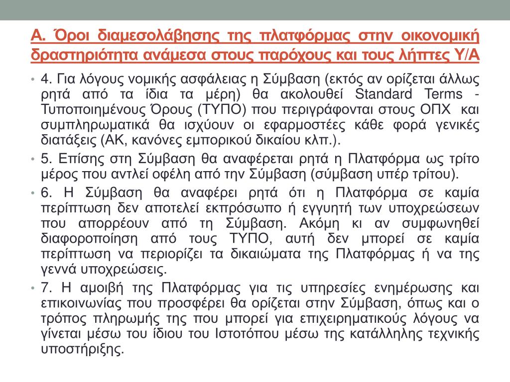 Α. Όροι διαμεσολάβησης της πλατφόρμας στην οικονομική δραστηριότητα ανάμεσα στους παρόχους και τους λήπτεςΥ/Α • 4. Για λόγους νομικής ασφάλειας η Σύμβαση(εκτός αν ορίζεται άλλως ρητά από τα ίδια τα μέρη) θα ακολουθεί Standard Terms - Τυποποιημένους Όρους (ΤΥΠΟ) που περιγράφονται στους ΟΠΧ και συμπληρωματικά θα ισχύουν οι εφαρμοστέες κάθε φορά γενικές διατάξεις (ΑΚ, κανόνες εμπορικού δικαίου κλπ.). • 5. Επίσης στη Σύμβασηθα αναφέρεται ρητά η Πλατφόρμα ως τρίτο μέρος που αντλεί οφέλη από την Σύμβαση (σύμβαση υπέρ τρίτου). • 6. ΗΣύμβαση θα αναφέρει ρητά ότι η Πλατφόρμα σε καμία περίπτωση δεν αποτελεί εκπρόσωπο ή εγγυητή των υποχρεώσεων που απορρέουν από τη Σύμβαση. Ακόμη κι αν συμφωνηθεί διαφοροποίηση από τους ΤΥΠΟ, αυτή δεν μπορεί σε καμία περίπτωση να περιορίζει τα δικαιώματα της Πλατφόρμας ή να της γεννά υποχρεώσεις. • 7. Η αμοιβή της Πλατφόρμας για τις υπηρεσίες ενημέρωσης και επικοινωνίας που προσφέρει θα ορίζεται στην Σύμβαση, όπως και ο τρόπος πληρωμής της που μπορεί για επιχειρηματικούς λόγους να γίνεται μέσω του ίδιου του Ιστοτόπου μέσω της κατάλληλης τεχνικής υποστήριξης.