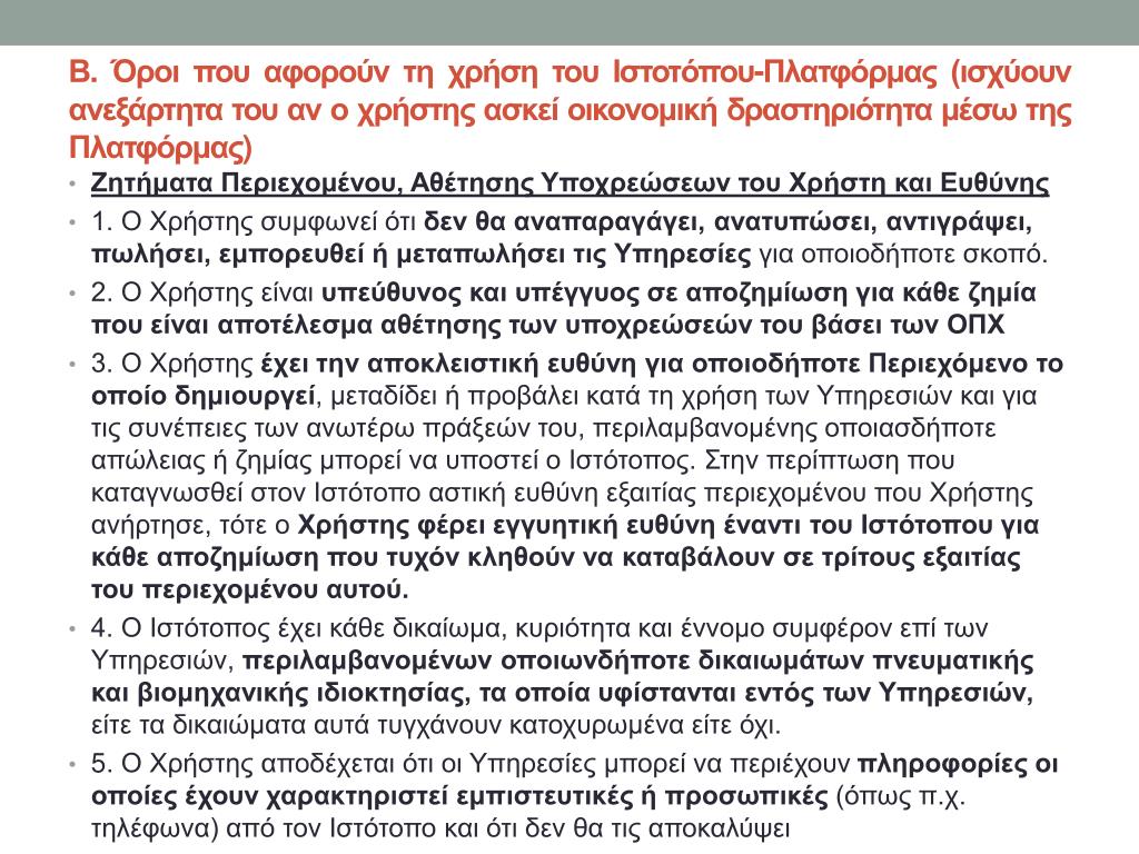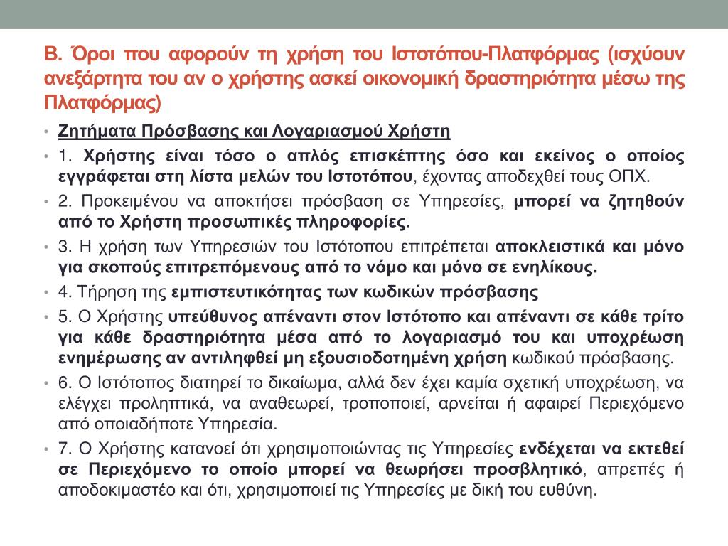 Β. Όροι που αφορούν τη χρήση του Ιστοτόπου-Πλατφόρμας (ισχύουν ανεξάρτητα του αν ο χρήστης ασκεί οικονομική δραστηριότητα μέσω της Πλατφόρμας) • Ζητήματα Πρόσβασης και Λογαριασμού Χρήστη • 1. Χρήστης είναι τόσο ο απλός επισκέπτης όσο και εκείνος ο οποίος εγγράφεται στη λίστα μελών του Ιστοτόπου, έχοντας αποδεχθεί τους ΟΠΧ. • 2. Προκειμένου να αποκτήσει πρόσβαση σε Υπηρεσίες, μπορεί να ζητηθούν από το Χρήστη προσωπικές πληροφορίες. • 3. Η χρήση των Υπηρεσιών του Ιστότοπου επιτρέπεται αποκλειστικά και μόνο για σκοπούς επιτρεπόμενους από το νόμο και μόνο σε ενηλίκους. • 4. Τήρηση της εμπιστευτικότητας των κωδικών πρόσβασης • 5. Ο Χρήστης υπεύθυνος απέναντι στον Ιστότοπο και απέναντι σε κάθε τρίτο για κάθε δραστηριότητα μέσα από το λογαριασμό του και υποχρέωση ενημέρωσης αν αντιληφθεί μη εξουσιοδοτημένη χρήση κωδικού πρόσβασης. • 6. Ο Ιστότοπος διατηρεί το δικαίωμα, αλλά δεν έχει καμία σχετική υποχρέωση, να ελέγχει προληπτικά, να αναθεωρεί, τροποποιεί, αρνείται ή αφαιρεί Περιεχόμενο από οποιαδήποτε Υπηρεσία. • 7. Ο Χρήστης κατανοεί ότι χρησιμοποιώντας τις Υπηρεσίες ενδέχεται να εκτεθεί σε Περιεχόμενο το οποίο μπορεί να θεωρήσει προσβλητικό, απρεπές ή αποδοκιμαστέο και ότι, χρησιμοποιεί τις Υπηρεσίες με δική του ευθύνη.