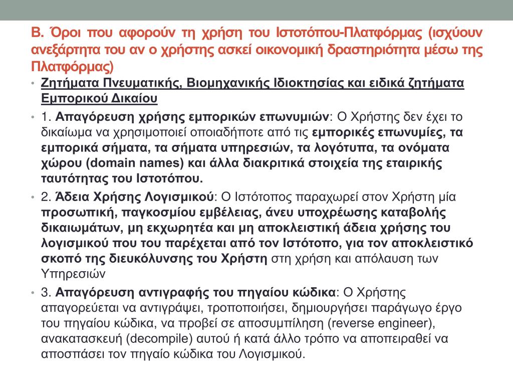 Β. Όροι που αφορούν τη χρήση του Ιστοτόπου-Πλατφόρμας (ισχύουν ανεξάρτητα του αν ο χρήστης ασκεί οικονομική δραστηριότητα μέσω της Πλατφόρμας) • Ζητήματα Πνευματικής, Βιομηχανικής Ιδιοκτησίας και ειδικά ζητήματα Εμπορικού Δικαίου • 1. Απαγόρευση χρήσης εμπορικών επωνυμιών: Ο Χρήστης δεν έχει το δικαίωμα να χρησιμοποιεί οποιαδήποτε από τις εμπορικές επωνυμίες, τα εμπορικά σήματα, τα σήματα υπηρεσιών, τα λογότυπα, τα ονόματα χώρου (domain names) και άλλα διακριτικά στοιχεία της εταιρικής ταυτότητας του Ιστοτόπου. • 2. Άδεια ΧρήσηςΛογισμικού: Ο Ιστότοπος παραχωρεί στον Χρήστη μία προσωπική, παγκοσμίου εμβέλειας, άνευ υποχρέωσης καταβολής δικαιωμάτων, μη εκχωρητέα και μη αποκλειστική άδεια χρήσης του λογισμικού που του παρέχεται από τον Ιστότοπο, για τον αποκλειστικό σκοπό της διευκόλυνσης του Χρήστη στη χρήση και απόλαυση των Υπηρεσιών • 3. Απαγόρευση αντιγραφής του πηγαίου κώδικα: Ο Χρήστης απαγορεύεται να αντιγράψει, τροποποιήσει, δημιουργήσει παράγωγο έργο του πηγαίου κώδικα, να προβεί σε αποσυμπίληση (reverse engineer), ανακατασκευή (decompile) αυτού ή κατά άλλο τρόπο να αποπειραθεί να αποσπάσει τον πηγαίο κώδικα του Λογισμικού.