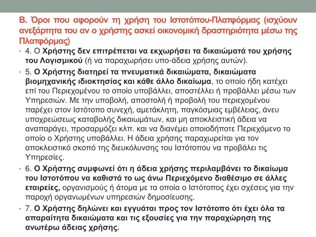 Β. Όροι που αφορούν τη χρήση του Ιστοτόπου-Πλατφόρμας (ισχύουν ανεξάρτητα του αν ο χρήστης ασκεί οικονομική δραστηριότητα μέσω της Πλατφόρμας) • 4. Ο Χρήστης δεν επιτρέπεται να εκχωρήσει τα δικαιώματά του χρήσης του Λογισμικού (ή να παραχωρήσει υπο-άδεια χρήσης αυτών). • 5. Ο Χρήστης διατηρεί τα πνευματικά δικαιώματα, δικαιώματα βιομηχανικής ιδιοκτησίας και κάθε άλλο δικαίωμα, το οποίο ήδη κατέχει επί του Περιεχομένου το οποίο υποβάλλει, αποστέλλει ή προβάλλει μέσω των Υπηρεσιών. Με την υποβολή, αποστολή ή προβολή του περιεχομένου παρέχει στον Ιστότοπο συνεχή, αμετάκλητη, παγκόσμιας εμβέλειας, άνευ υποχρεώσεως καταβολής δικαιωμάτων, και μη αποκλειστική άδεια να αναπαράγει, προσαρμόζεικλπ. και να διανέμει οποιοδήποτε Περιεχόμενο το οποίο ο Χρήστης υποβάλλει. Η άδεια χρήσης παραχωρείται για τον αποκλειστικό σκοπό της διευκόλυνσης του Ιστότοπου να προβάλειτις Υπηρεσίες. • 6. Ο Χρήστης συμφωνεί ότι η άδεια χρήσης περιλαμβάνει το δικαίωμα του Ιστοτόπου να καθιστά το ως άνω Περιεχόμενο διαθέσιμο σε άλλες εταιρείες, οργανισμούς ή άτομα με τα οποία ο Ιστότοπος έχει σχέσεις για την παροχή οργανωμένων υπηρεσιών δημοσίευσης. • 7. Ο Χρήστης δηλώνει και εγγυάται προς τον Ιστότοπο ότι έχει όλα τα απαραίτητα δικαιώματα και τις εξουσίες για την παραχώρηση της ανωτέρω άδειας χρήσης.