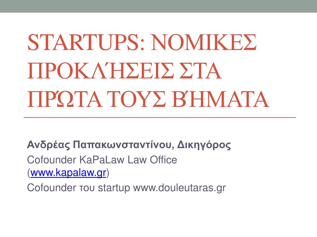 StartupS: Νομικες προκλήσεις στα πρώτα τους βήματα Ανδρέας Παπακωνσταντίνου, Δικηγόρος Cofounder KaPaLawLaw Office (www.kapalaw.gr) Cofounder του startup www.douleutaras.gr