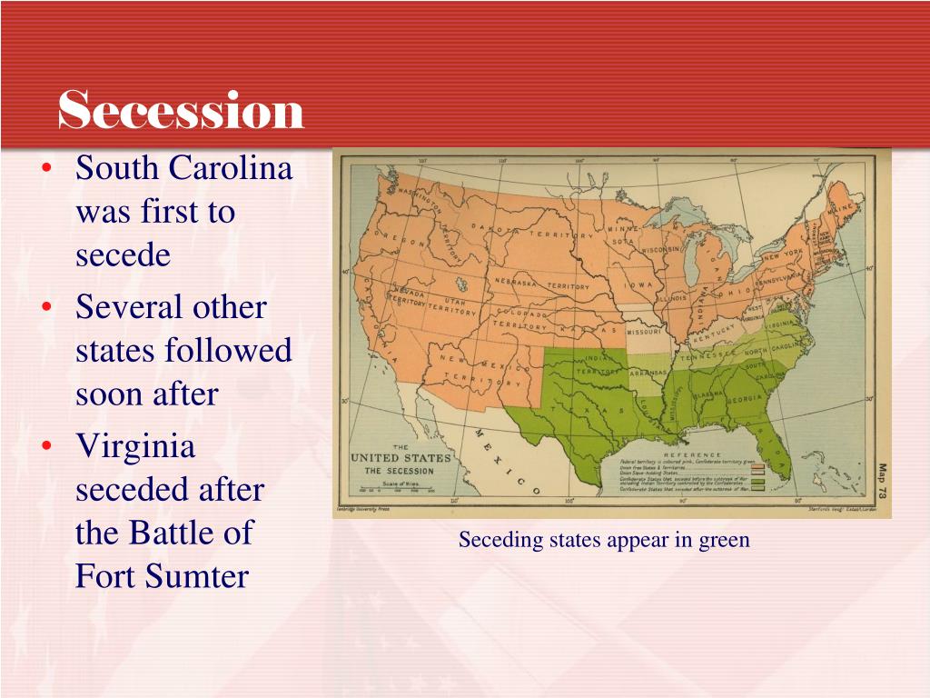 Secession • South Carolina was first to secede • Several other states followed soon after • Virginia seceded after the Battle of Fort Sumter Seceding states appear in green