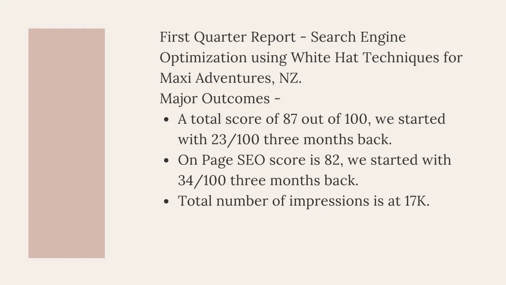 First Quarter Report - Search Engine Optimization using White Hat Techniques for Maxi Adventures, NZ. Major Outcomes - A total score of 87 out of 100, we started with 23/100 three months back. On Page SEO score is 82, we started with 34/100 three months back. Total number of impressions is at 17K.