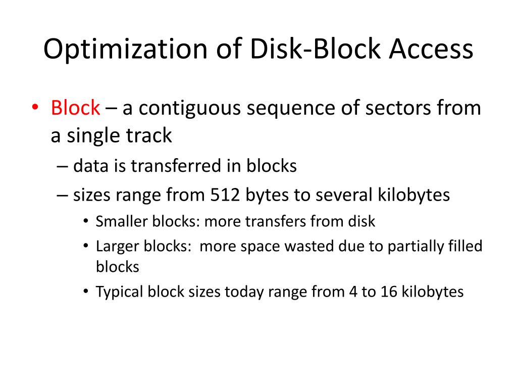 Optimization of Disk-Block Access • Block – a contiguous sequence of sectors from a single track • data is transferred in blocks • sizes range from 512 bytes to several kilobytes • Smaller blocks: more transfers from disk • Larger blocks: more space wasted due to partially filled blocks • Typical block sizes today range from 4 to 16 kilobytes