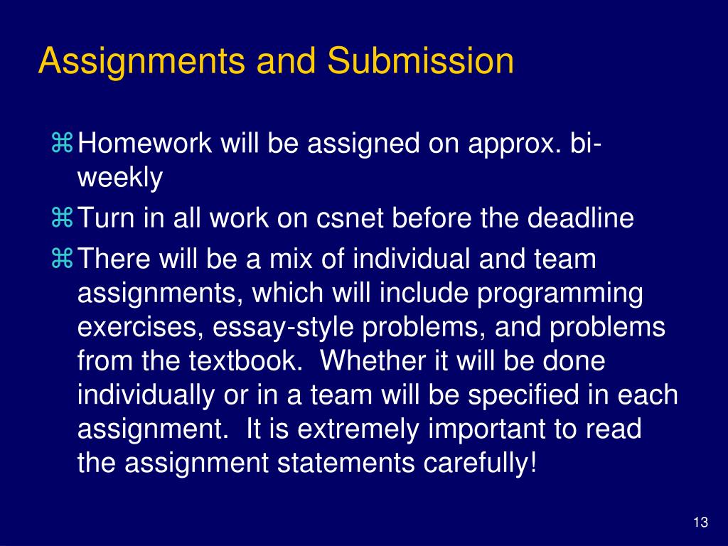 Assignments and Submission • Homework will be assigned on approx. bi-weekly • Turn in all work on csnet before the deadline • There will be a mix of individual and team assignments, which will include programming exercises, essay-style problems, and problems from the textbook. Whether it will be done individually or in a team will be specified in each assignment. It is extremely important to read the assignment statements carefully!
