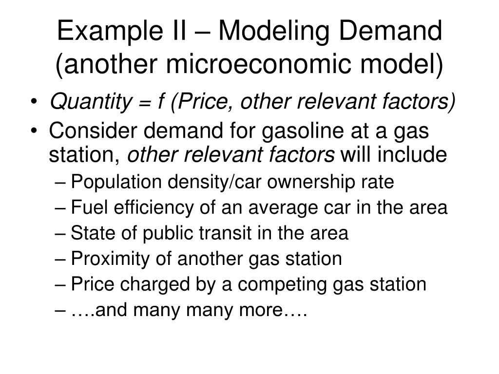 Example II – Modeling Demand(another microeconomic model) • Quantity = f (Price, other relevant factors) • Consider demand for gasoline at a gas station, other relevant factors will include • Population density/car ownership rate • Fuel efficiency of an average car in the area • State of public transit in the area • Proximity of another gas station • Price charged by a competing gas station • ….and many many more….