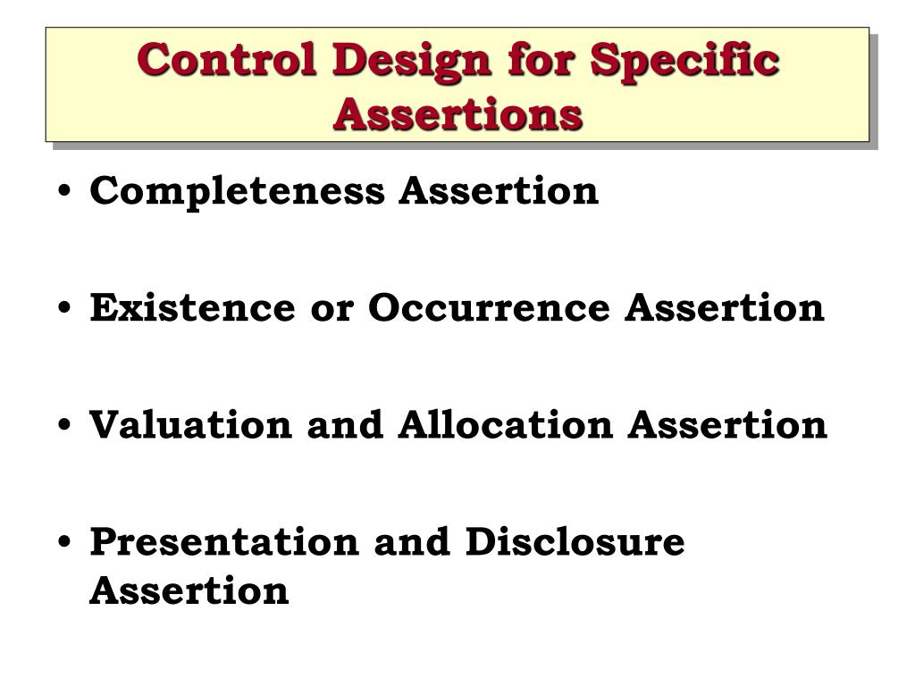 Control Design for Specific Assertions • Completeness Assertion • Existence or Occurrence Assertion • Valuation and Allocation Assertion • Presentation and Disclosure Assertion