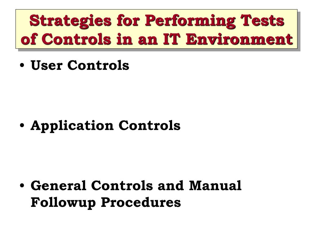Strategies for Performing Tests of Controls in an IT Environment • User Controls • Application Controls • General Controls and Manual Followup Procedures