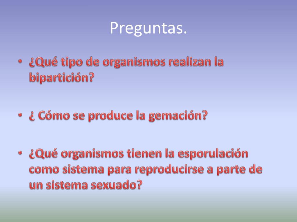 Preguntas. • ¿Qué tipo de organismos realizan la bipartición? • ¿ Cómo se produce la gemación? • ¿Qué organismos tienen la esporulación como sistema para reproducirse a parte de un sistema sexuado?
