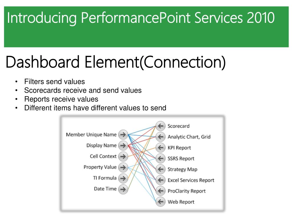 Introducing PerformancePoint Services 2010 Dashboard Element(Connection) • Filters send values • Scorecards receive and send values • Reports receive values • Different items have different values to send