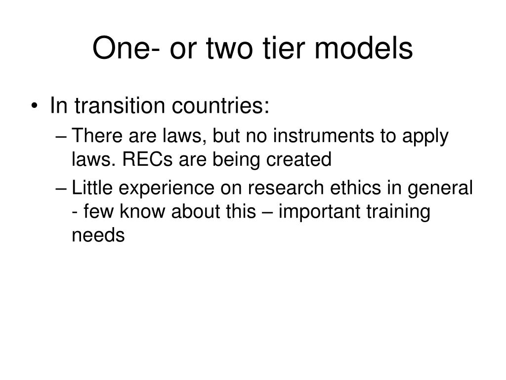 One- or two tier models • In transition countries: • There are laws, but no instruments to apply laws. RECs are being created • Little experience on research ethics in general - few know about this – important training needs