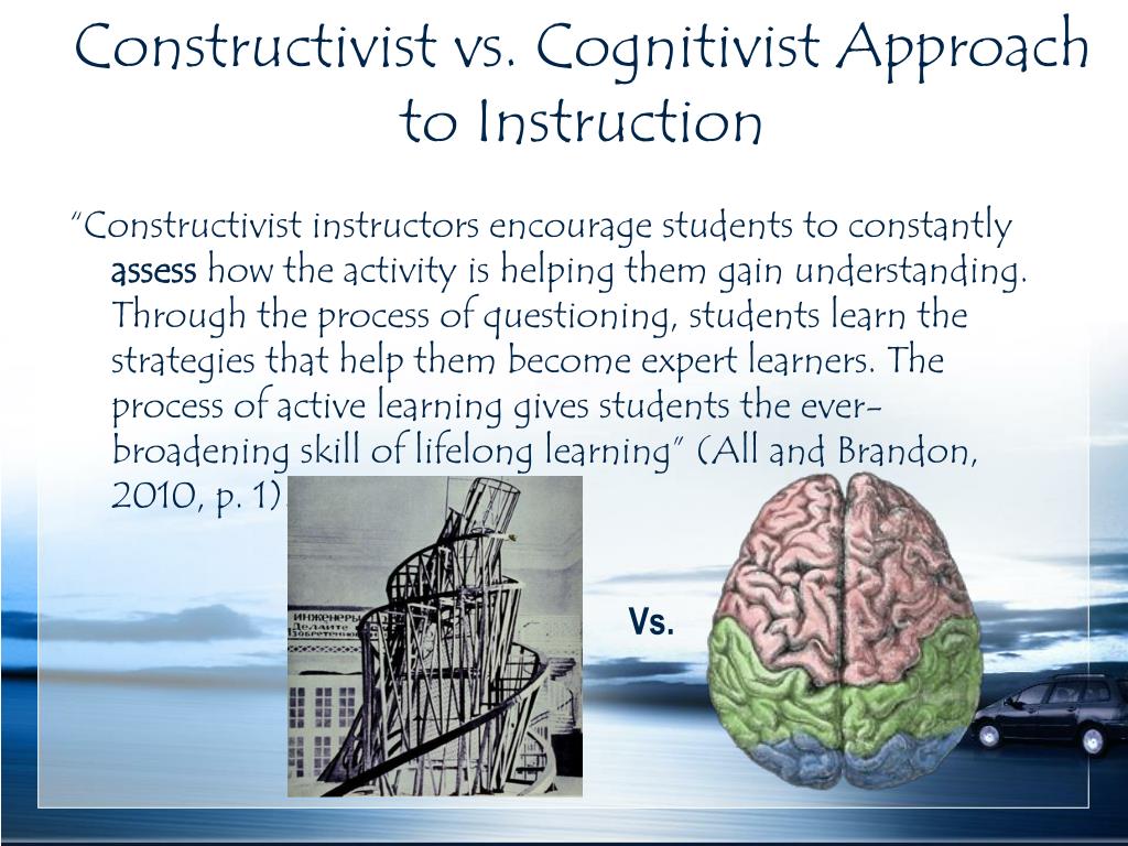 Constructivist vs. Cognitivist Approach to Instruction • “Constructivist instructors encourage students to constantly assess how the activity is helping them gain understanding. Through the process of questioning, students learn the strategies that help them become expert learners. The process of active learning gives students the ever-broadening skill of lifelong learning” (All and Brandon, 2010, p. 1). Vs.